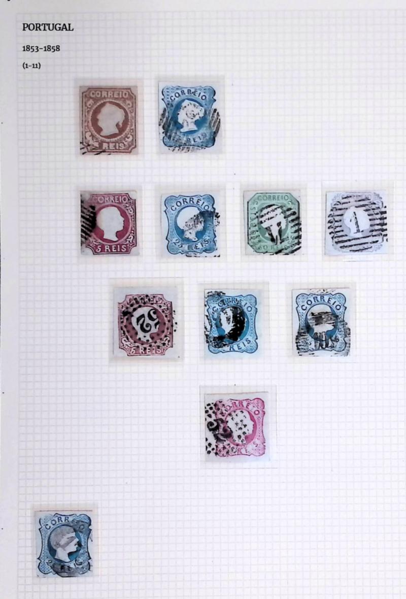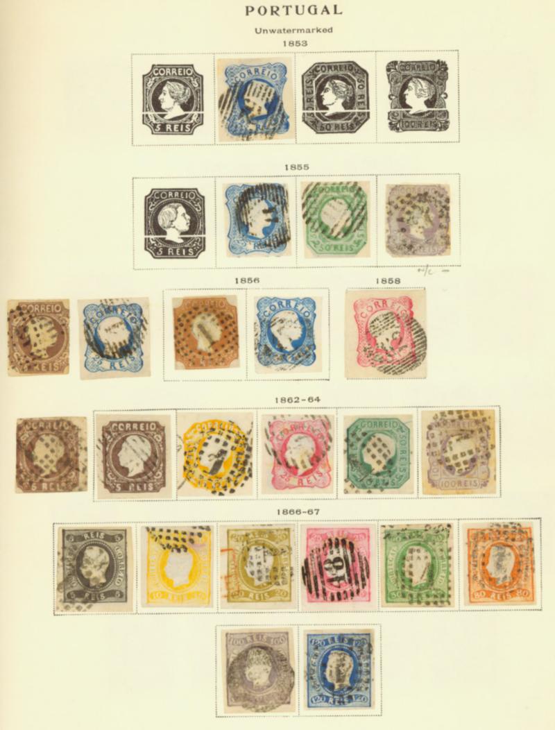 Stately Portuguese holding. Nineteenth-century collection mounted on four clean homemade pages. Stamps are used, issued between 1853 and 1884. Good overall value. Stamps appear fresh, vibrant, and sharp. Winning accumulation of classic Portuguese material. Inspect for design, color, and paper varieties. Scans show entire lot. (Image)