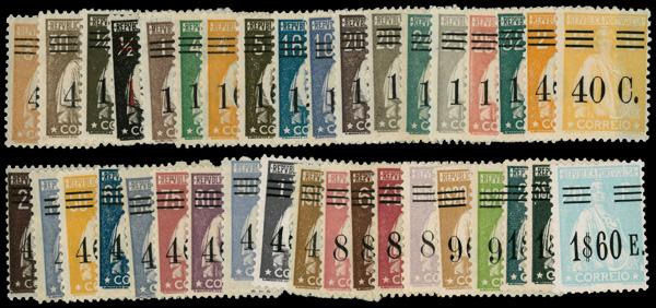 1928-29, Ceres, 4c-1.60e surcharges on ¼c-20e complete (Scott 453-489), o.g., lightly hinged or hinge remnant, Fine to Very Fine. Scott $129. (Image)