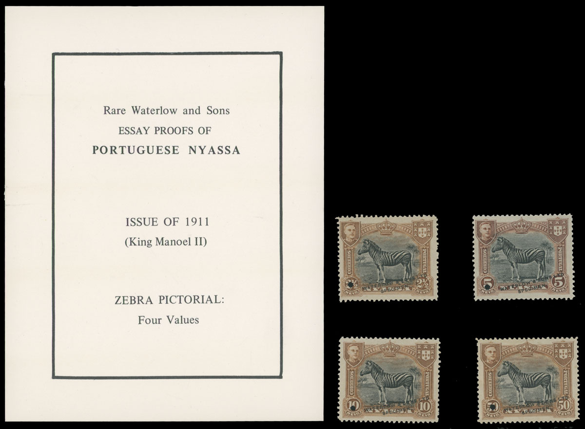 1911, Zebra 2½r, 5r, 10r, and 50r, four trading proofs (essays) in light brown and black, no diagonal overprint, each one with puncture at left and black two-line overprint, no gum as produced, VF and rare, original Waterlow and Sons, Ltd card is enclosed, Est. $300-$350 (Image)