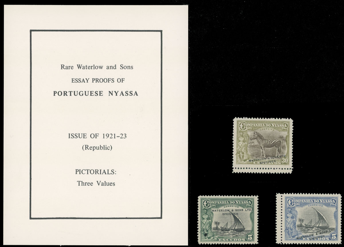 1921-23, Vasco da Gama 5c and 6c, both are in ultra and black, ''San Gabriel'' 15c and 20c, both are in carmine and ultra, four trading proofs (essays), each one with puncture at left and black two-line overprint, no gum as produced, VF and rare, two original Waterlow and Sons, Ltd cards are enclosed, Est. $300-$350 (Image)