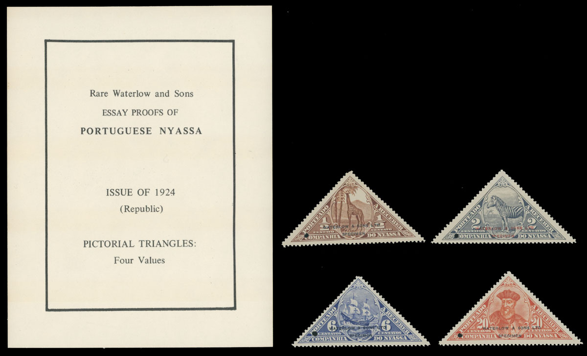 Postage Due stamps. 1924, Giraffe ½c in yellow brown, Zebra 2c gray violet, ''San Gabriel'' 6c ultra and Vasco da Gama 20c orange, four trading triangle proofs (essays), each one with puncture at left and black two-line overprint, no gum as produced, VF and rare, original Waterlow and Sons, Ltd card is enclosed, Est. $300-$350 (Image)