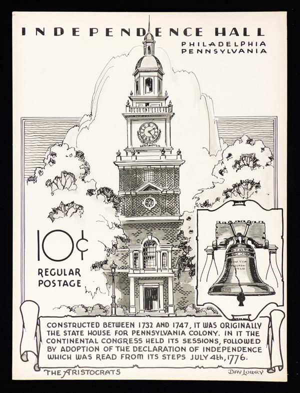 Dan Lowry,Original Cachet Production Art (1044), 20" x 15" art board with unique pen and ink drawing used by The Aristocrats; very attractive oversized original illustration perfect for framing or as part of an exhibit of the Independence Hall 10¢ Issue released in 1956. Shipping charges apply - weight 1 lbs. (Image)