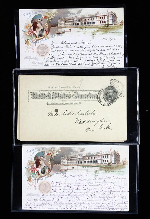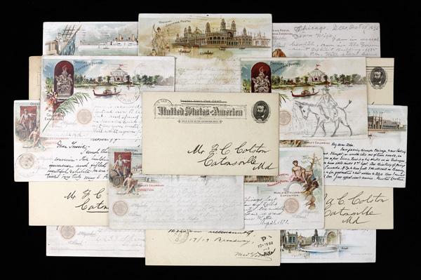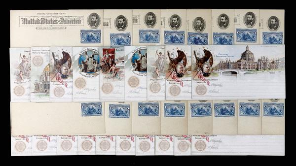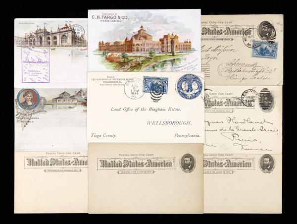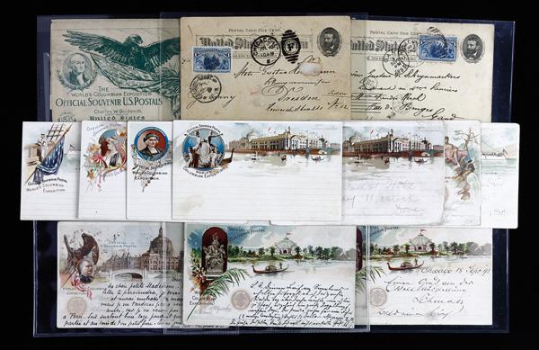 1893, Assortment of Columbian Exposition Souvenir Postal Cards & Wrappers (UPSS EX12, EX13), features 19 postcards and wrappers, all used; an impressive group with many desirable pieces such as items from sets 1, 2, 3, 5, 6, and others; features two very nice Goldsmith wrappers, with one appropriately posted; condition ranges from fair to very fine; an attractive group that would be a truly superb acquisition for any Columbian Exposition collector. (PDF for this Lot) (Image)