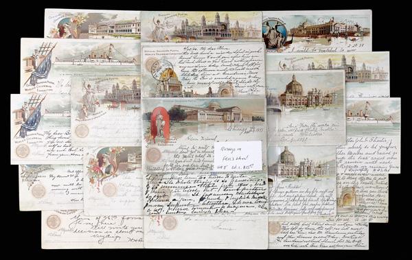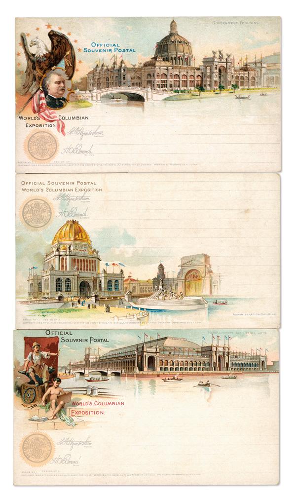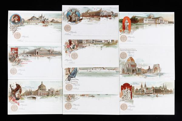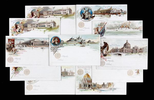 1893, Group of Columbian Exposition Official Postal Card Souvenir Set 2, 5, & 6 Full Sized Postal Cards with World's Fair Station Postmarks, 18 postal cards in total, some international use pieces; various designs present; condition varies, many in better condition. (PDF for this Lot) (Image)