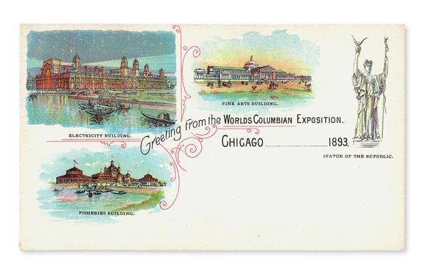 1893, Columbian Exposition Electricity, Fine Arts, & Fisheries Building Postal Card, in unused, very fine condition; E54 in Handbook of the Post Cards of the World's Columbian Exposition (Wukasch). (Image)