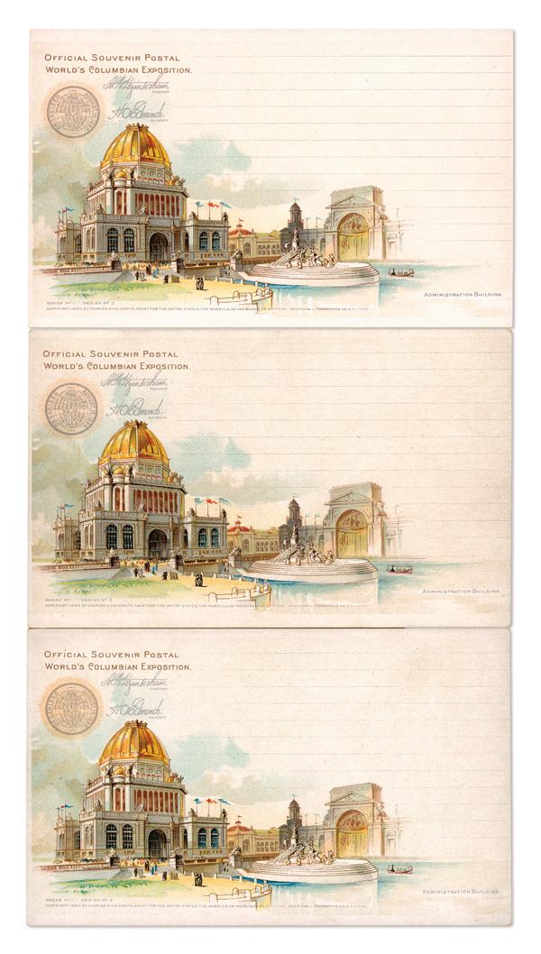 1893, Group of Columbian Exposition Printed Advertising on Goldsmith Postal Cards (UPSS EX15, EX16, EX17, EX23, EX), seven postal cards in total; condition varies, with four with staining and three in good or very good condition; an attractive and desirable advertising group. (Image)