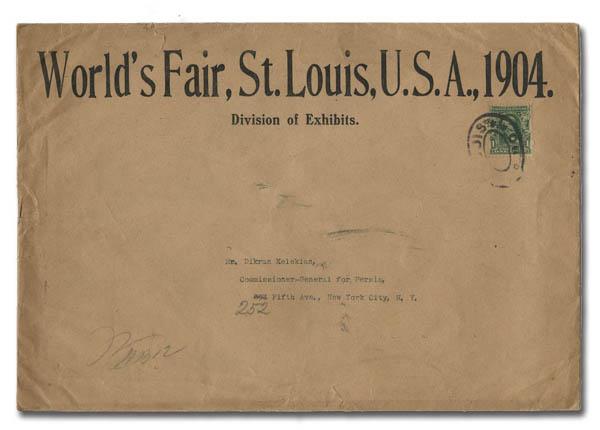 1904, 1¢ blue green on Oversize Cover from St. Louis World's Fair Division of Exhibits (Scott 300), sent from the Division of Exhibits to Mr. Dikran Kelekian, Commissioner General for Persia; a very attractive oversize cover; features some very slight tears on top left, bottom center, and left side. (Image)