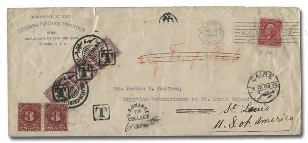 1903, Louisiana Purchase Exposition Dept. of Fish & Game Cover Forwarded from Cairo, Egypt to St. Louis, Missouri (Exposition Grounds) (Scott 301, J40), an impressive and interesting cover that was sent from the Louisiana Purchase Exposition in St. Louis to Mr. Herman E. Lauford, Egyptian Commissioner to the Exposition in Cairo, Egypt; the cover apparently arrived in Egypt on July 29, 1903 (sporting appropriate Postage Due stamps), and then proceeded to follow Mr. Lauford all the way back to St. Louis on August 22, 1903. (Image)
