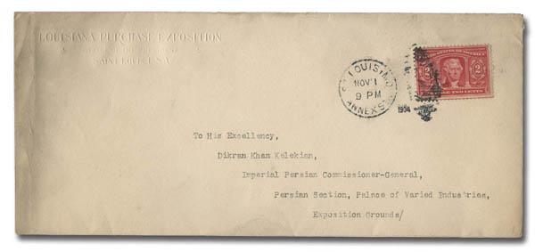 1904, 2¢ Louisiana Purchase on Cover Mailed from Office of the Exposition President to Persian Commissioner General (Exposition Grounds) (Scott 324), cancelled November 1, 1904; a very attractive cover; does feature some notable wear, with damage to flap on back. (Image)