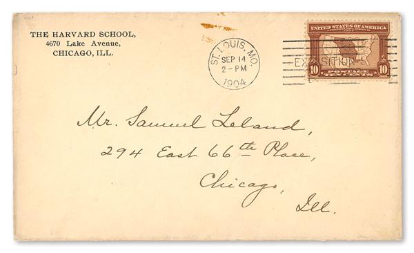 1904, 10¢ Louisiana Purchase on Cover with Exposition Cancel (Scott 327), cancelled September 14, 1904; franked five times the standard 2¢ rate; addressed to Chicago, Illinois. (Image)