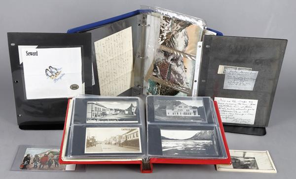United States, Alaska postal history 1899-1940, Documents, envelopes and postcards from Alaska pre-statehood; sheet of 20 coupons from the Alaska Mexican Gold Mining Company; 1900 stock certificate Alaska-Snettisham Gold Mining Company; 1899 letter from Sumdum Mining Company with Department of the Interior envelope; extensive correspondence (1913-1917) concerning the opening and early operation of the post office at Thane AK; 1918 shipping receipt from US Mail Boat Pheasant from Juneau City wharf to Windham Bay; stock certificate from Alaska Treadwell Gold Mining; and Showgard cover album with 75 early picture postcards (including some real photo postcards), and three modern Collins covers; beautiful, Fine to Very Fine. Shipping charges apply - weight 5.8 lbs. (Video for this lot) (Video2 for this lot) (Video3 for this lot) (Image)