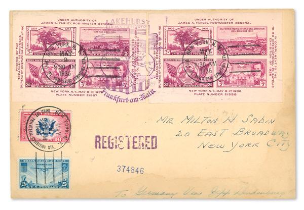 1936 (May 9), First North America Flight Cover, TIPEX-franked (Sieger 409 D), Registered cover bearing two TIPEX souvenir sheets plus #C20 and CE2 addressed to Milton Sabin in New York City; stamps all cancelled by Expo cancel with violet flight cachet, reverse with all proper backstamps including Frankfurt receiver Type 1; damp staining at bottom, Fine to Very Fine. (Image)