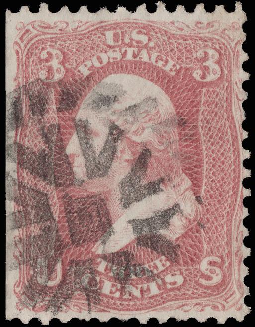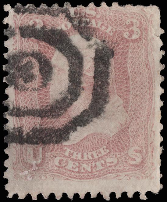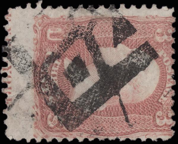 Negative "3" in Double Hexagon of Fort Plain, N.Y. (Skinner-Eno Unlisted), bold 60% strike of this unusual cancel on a 3¢ rose (65). (Image)