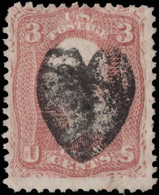 Solid Heart (Skinner-Eno Unlisted), "socked-on-the-nose" of a Fine 3¢ rose (65). (Image)
