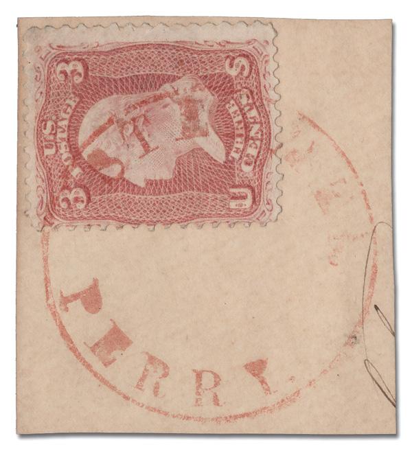 "Steamer/Perry" (Skinner-Eno Unlisted), mostly clear strike of this large red circular handstamp ties a Fine 3¢ rose (65) ion piece. (Image)