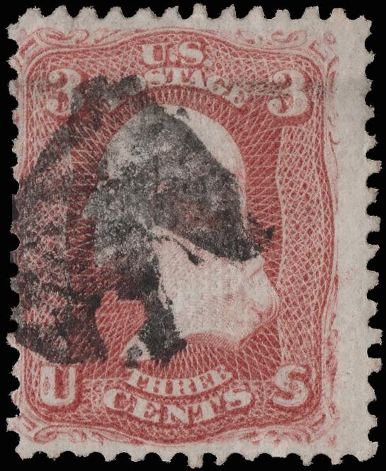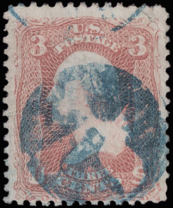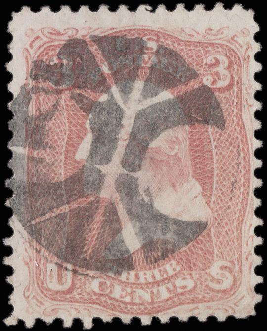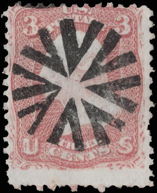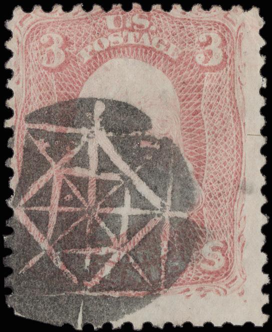 Elaborate Circular Geometric (Skinner-Eno GE-C 157), bold 75% strike on a 3¢ rose (65). (Image)