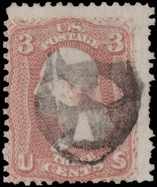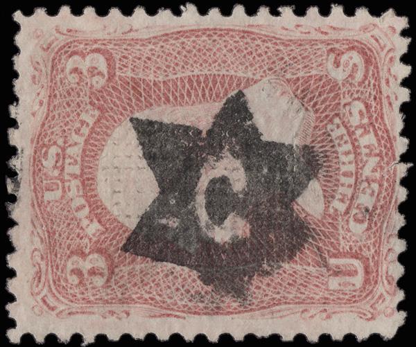 Masonic "G" in 6-Point Star of Rutland, Vt. (Skinner-Eno ST-C 23), choice complete strike on a Fine 3¢ E. grill (88). (Image)