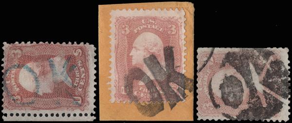 "OK", Group of three (Skinner-Eno LC-OK 3, 5, 22), all well struck, the first in blue, on 3¢ 1861s. (Image)