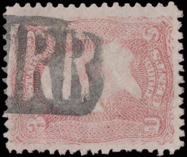 Negative "LIRR", Long Island R.R. (Skinner-Eno LC-L 2), strong 65% strike on a 3¢ rose (65). Towle 112-C-1. (Image)