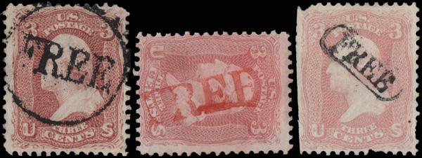 "FREE", Group of three (Skinner-Eno Unlisted), all nice strikes; one in circle, one in oblong box, one unframed in red. (Image)