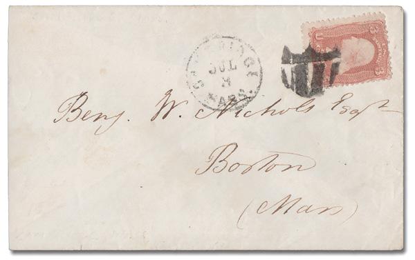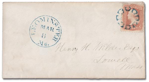Stovepipe of Leominster, Mass. (Skinner-Eno GE-C 7), a gorgeous strike in blue ties a 3¢ rose pink (64b), postmarked with a matching Mar 8 Leominster c.d.s., on a cover to Lowell, Mass. (Image)