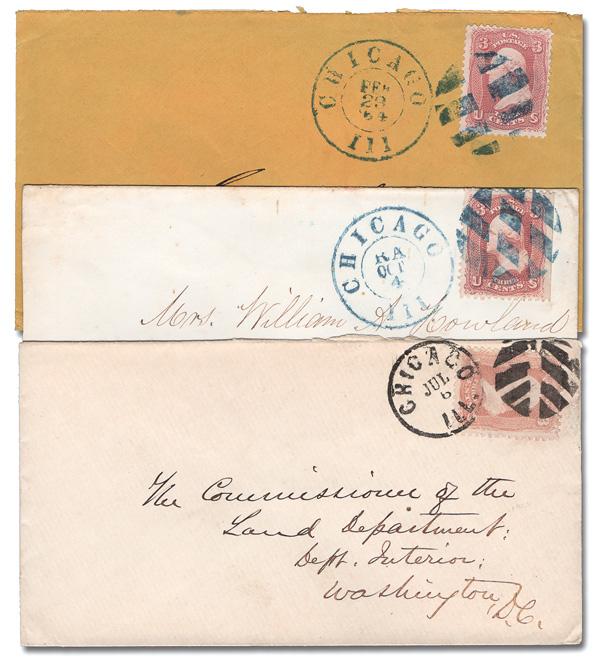 Geometrics of Chicago, Ill. (Skinner-Eno Unlisted), three clean covers with gorgeous strikes, two of them in blue with matching c.d.s.s. (Image)
