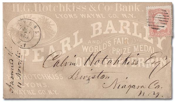 8-Bar Open Grid of Lyons, N.Y. (Skinner-Eno Unlisted), just ties a 3¢ rose pink (64b) on an all-over illustrated advertising cover to Lewiston, N.Y, with a Nov 7, 1865 c.d.s. (inverted year); the cover, from "Hotchkiss & Co. Bank, advertises "Bearl Baily and World's Fair Prize Media Oil of Peppermint"". (Image)