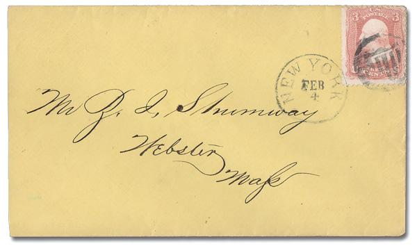 5-Bar Shield in Circle of New York, N.Y. (Skinner-Eno PS-FC 22), excellent, nearly complete strike ties a 3¢ rose (65) on a pretty yellow cover to Webster, Mass. with a clear Feb 4 New York c.d.s. (Image)