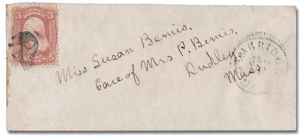 Skull of Cambridge, Mass. (Skinner-Eno PH-M 32), excellent strike ties a 3¢ rose (65) on a small cover to Dudley, Mass.; partial Jan 11 Cambridge c.d.s. (Image)