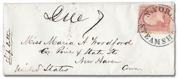 "N. YORK/STEAMSHIP" (Skinner-Eno PM-SS 2), excellent strike ties a 3¢ rose (65) on a cover to New Haven, Ct. with an manuscript "7" (cents due). (Image)