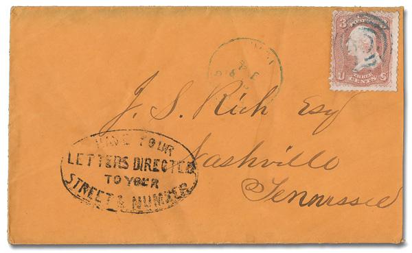 "Have Your Letters Directed to Your Street Number" (Skinner-Eno Unlisted), nice, virtually complete oval on a cover franked with a 3¢ rose (65) canceled with a blue target alongside a weak blue Feb 14 Lewis, Ioa. c.d.s.; to Nashville, Tenn. (Image)