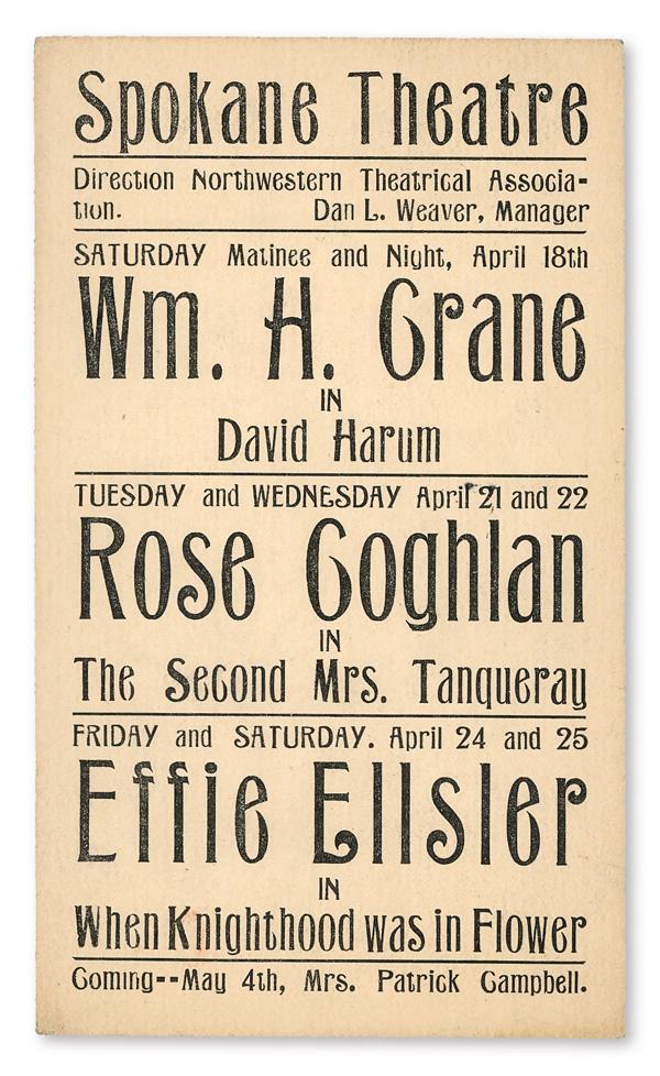 [Theater], Two announcements on postal cards, from Boston (on #UX14, sent Sept. 4, 1896 to Waitsburg, Wash. with flag cancel) and Spokane (#UX18, local use, typed address but no cancel), each listing upcoming performances; Boston card notes price of performances (15¢-25¢) and includes two "Darkey Plays", Fine to Very Fine. (Image)