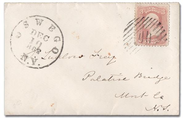 Unusual Grid of Oswego, N.Y. (Skinner-Eno SD-G 24), clear 75% strike ties a 3¢ rose pink (64b) on a neat ladies' envelope to Palatine Bridge, N.Y. with a clear balloon-type Oswego c.d.s., Dec 10, 1862. (Image)