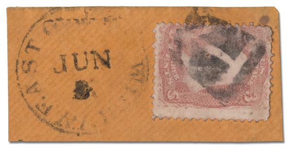 Shield with 3 Bars, Open Top of Pittsburgh, Pa. (Skinner-Eno PS-O 9), beautiful, complete strike on a fresh, F-VF 3¢ rose (65). (Image)