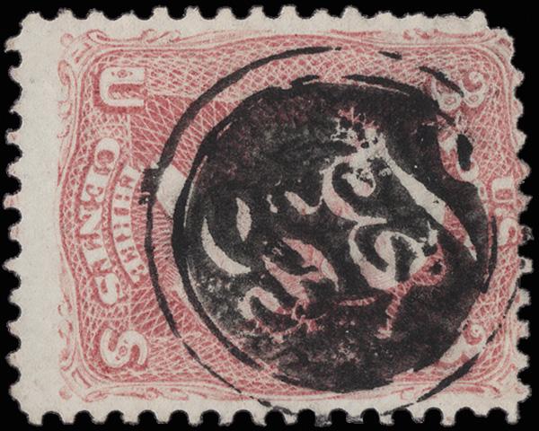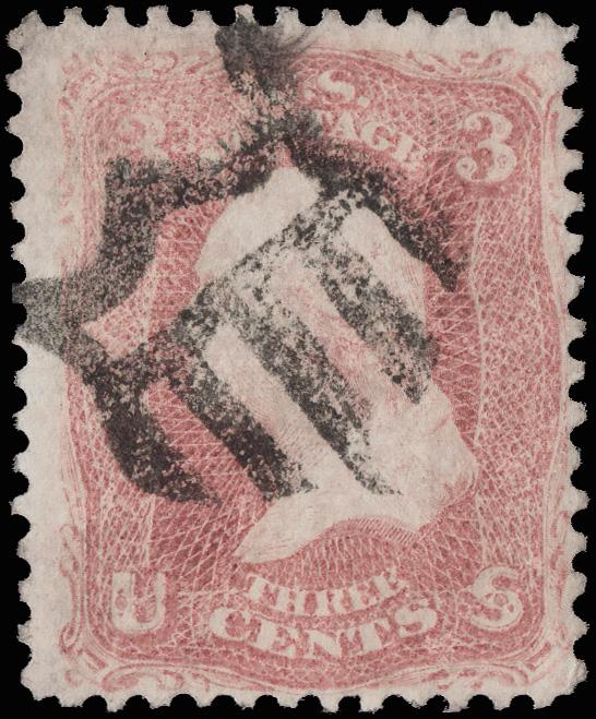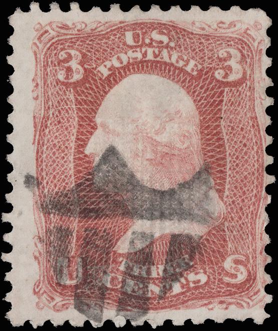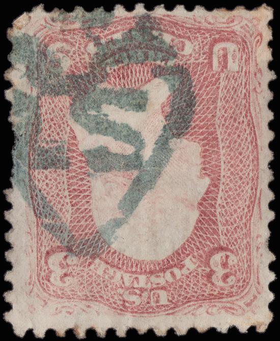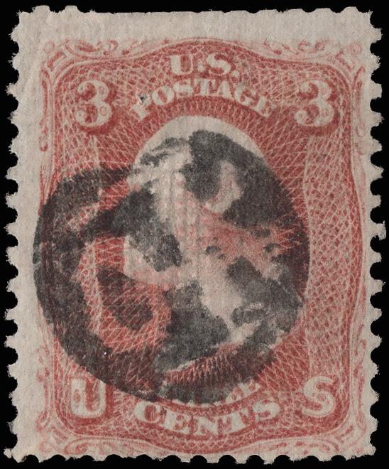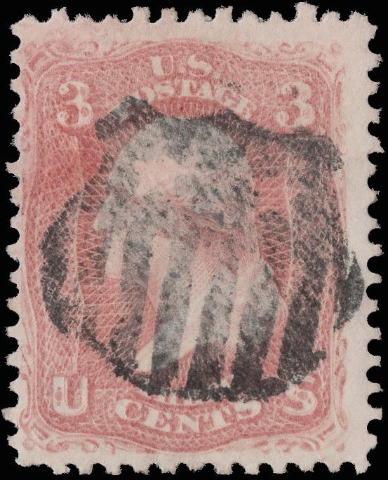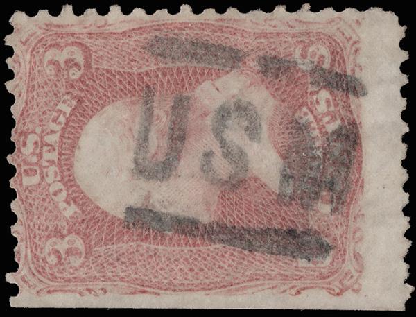 "USM" Between Lines of Kansas City, Mo.(?) (Skinner-Eno PT-USM 3), perfect strike on a 3¢ rose (65). (Image)