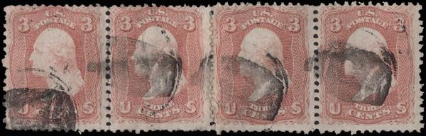 Barrel of Oil City, Pa. (Skinner-Eno PO-BB 3), on e nice strike plus three lesser strikes on a strip of 4 of 3¢ rose (65). (Image)
