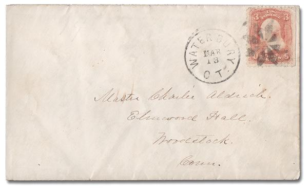 8-Point Rosette of Waterbury, Ct. (Skinner-Eno GE-R 58), Fine strike, alongside a type T-2 Mar 13 Waterbury c.d.s., ties a 3¢ rose (65) on a cover to Woodstock, Ct. Rohloff Rarity RR (not more than 15 known). Rohloff P-10. (Image)
