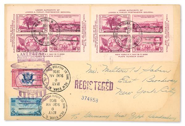 1936 (May 9), First North America Flight Cover, TIPEX-franked (Sieger 409 D), Registered cover bearing two TIPEX souvenir sheets plus #C20 and CE2 addressed to Milton Sabin in New York City; stamps all cancelled by Expo cancel with violet flight cachet, reverse with all proper backstamps including Frankfurt receiver Type 1; damp staining at bottom, Fine to Very Fine. (Image)