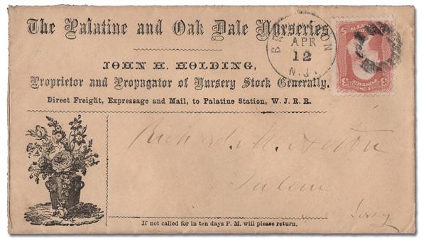 Small Lined Circle of Bridgeton, N.J. (Skinner-Eno Unlisted), excellent strike, duplexed with (?) a Bridgeton c.d.s. ties a 3¢ rose (65) on an illustrated advertising cover for Palatine and Oak Dale Nurseries, "Direct Freight, Expressage and Mail, to Palatine Station, W.J.R.R [West Jersey Rail Road] featuring a flower arrangement in a large pot; to Salem, N.J. (Image)