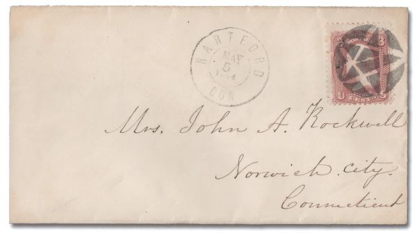 Negative 5-Point Star in Circle of Hartford, Ct. (Skinner-Eno Unlisted), extraordinary strike of this distinctive cancel ties a 3¢ rose (65) on a small, clea cover to Norwich City, Ct. with a lt Hartford c.d.s., May 5, 1864. (Image)