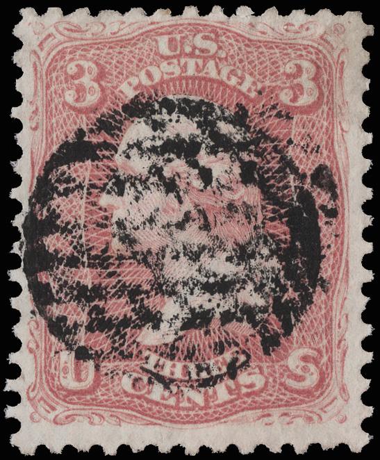 Elaborate Circular Geometric (Skinner-Eno Unlisted), perfect, "socked-on-the-nose" strike on a Very Fine 3¢ rose (65). (Image)