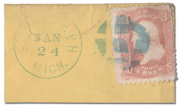 Negative Masonic Square & Compass of St. Joseph, Mich. (Skinner-Eno FR-M3a 14), clear, virtually complete strike in blue ties a 3¢ rose (65) on piece alongside a matching Jan 24 St. Joseph c.d.s. (Image)