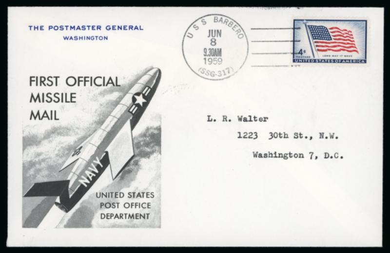 1959 USA first official missile mail "USS Babero" printed cover with 4c tied by USS Barbero duplex, Jacksonville arrival, plus letter from the Postmaster General. (Image)