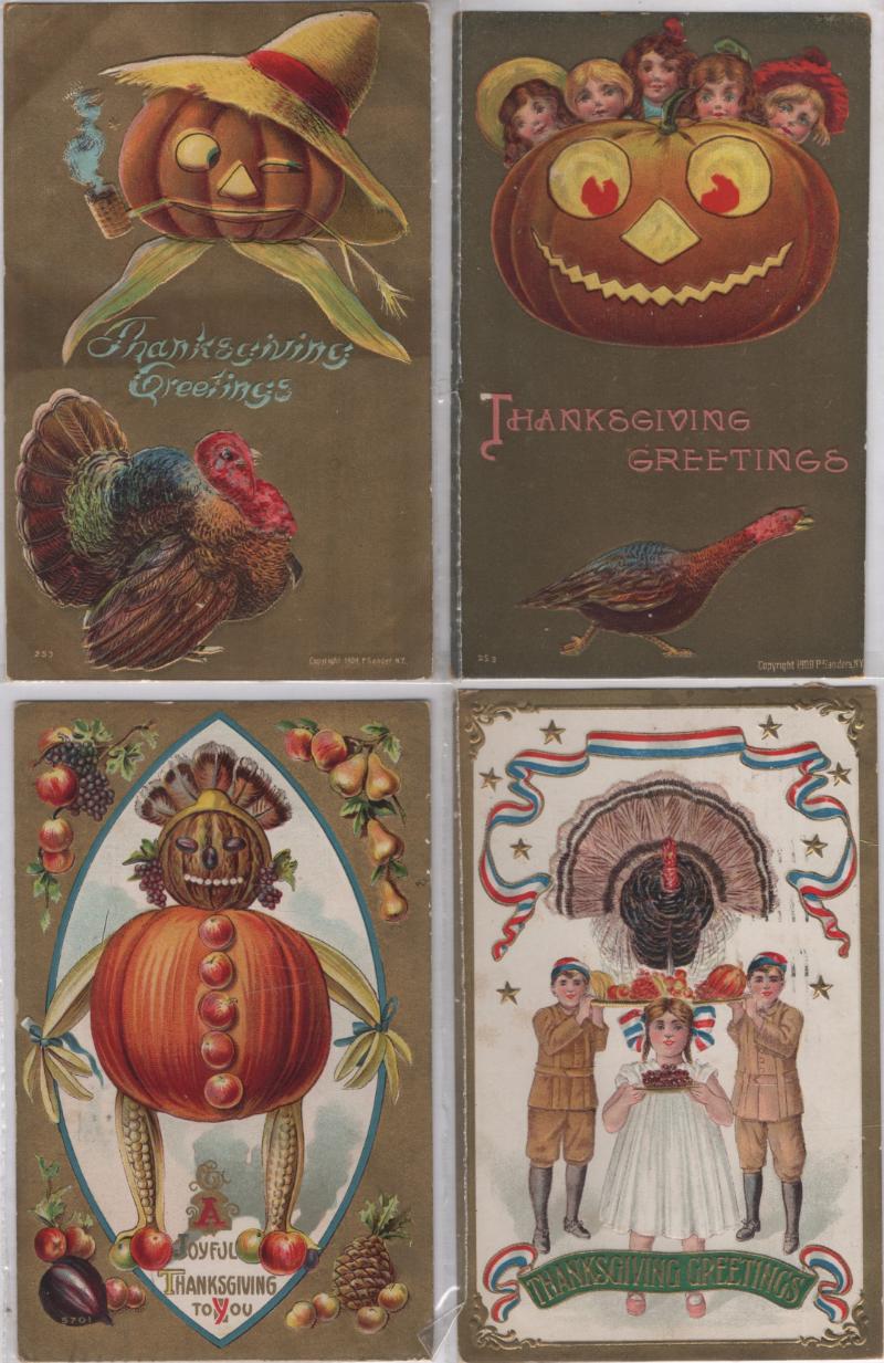 THANKSGIVING (215) vintage PPC, most w/ turkeys, many children, patriotic themes, very colorful, no plain commons (noted at least one Clapsaddle), a few dup, most sleeved, some typical wear, gen F-VF (Image)