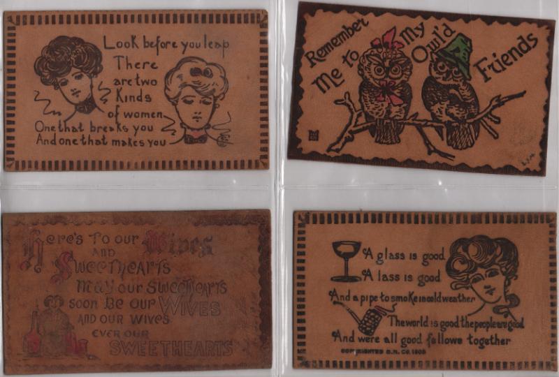 Binder w/ (92) leather postcards, most w/ color features, one w/ cotton added (Houston, TX), incl greetings, humor, rebuses; a few w/ minor scraping as most were mailed, gen F-VF (Image)