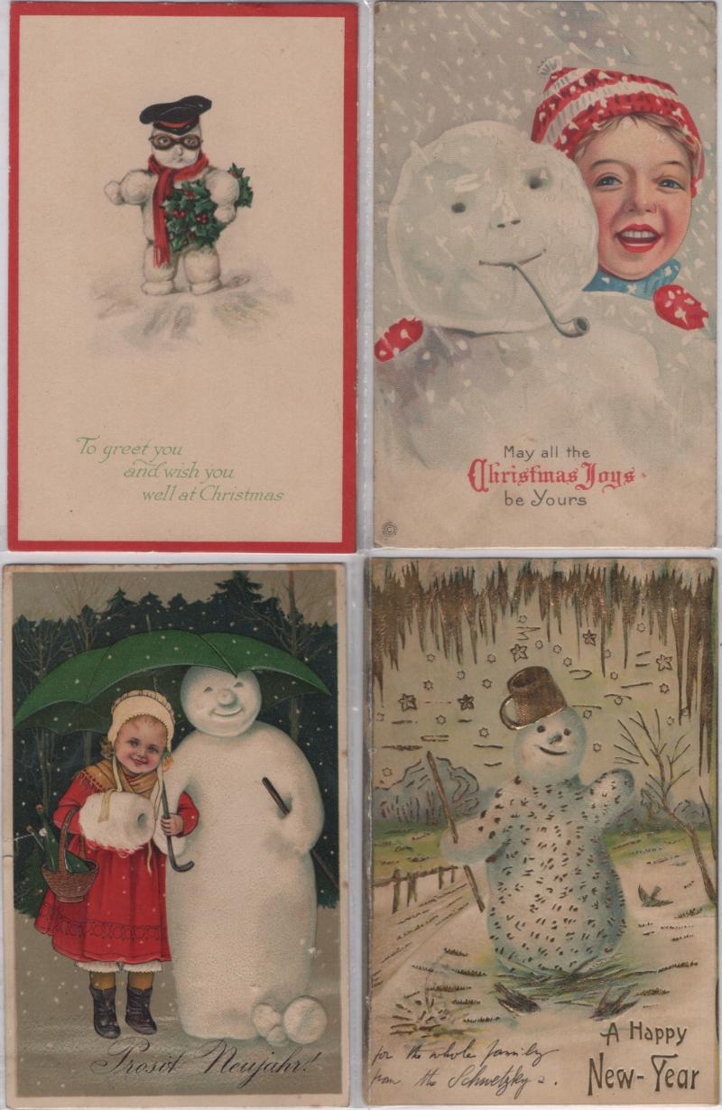 SNOWMEN ON PPC (109) w/ several dup; a few European, some mailed, all sleeved, a few are snow women; Christmas & New Year greetings, many w/ children; a few flts, gen F-VF (Image)