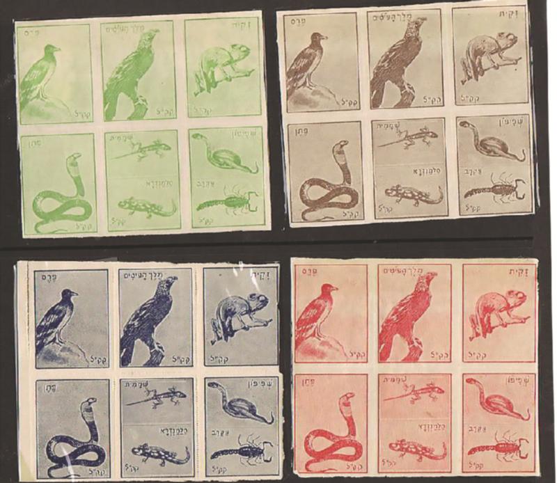JNF 1901 SPECIALIZED COLLECTION of the ZION issue, including ESSAY SHEETLET of the first stamp (less than ten exist), proofs and color trials, also 12 half sheets with country codes, and most unusual "Telegram" with Zion stamps. Photos. Estimated Value $8000-$10,000. (Image)