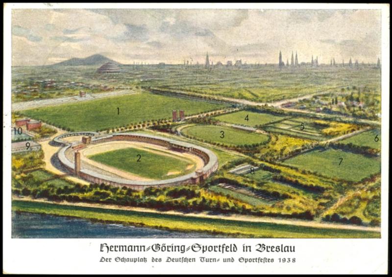 German gymnast and athletic festival 1938. Coloured card "Hermann Goering athletics ground in Wroclaw" in survey. Officially celebration postcard. Used, slight traces of use. (Image 1)(Image)