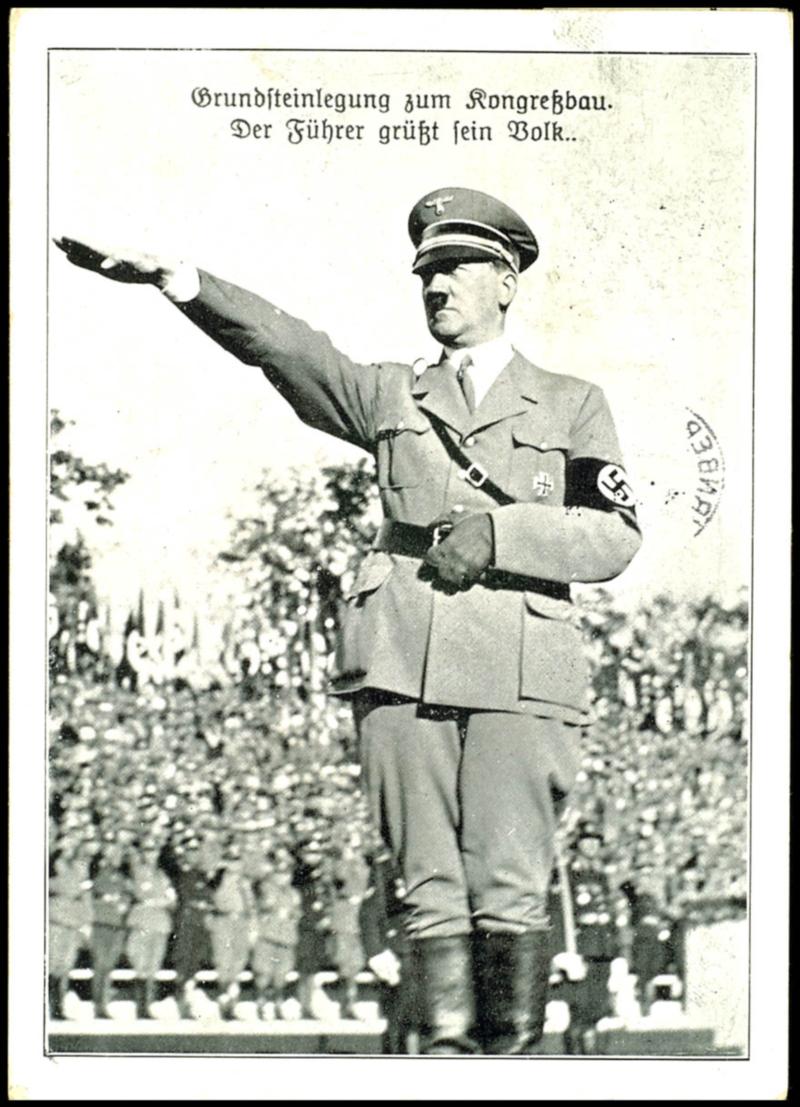 1936, "greatings from Nuremberg city the Nazi Party Congress Days", s / w card "laying the foundation stone to the congress building - the leader greets be people", mailed to Offenburg, cancelled by appropriate advertising meter-mark "Nuremberg 13.9.36", transport traces. (Image 1)(Image)
