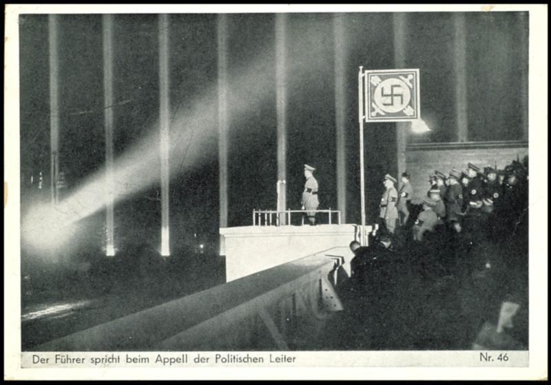 1937, Reichsparteitag, s/w-Karte "Der Führer spricht beim Appell der Politischen Leiter", gelaufen nach Bad Cannstatt, entwertet mit anlassbezogenem Sonderstempel "Nürnberg 13.9.37"